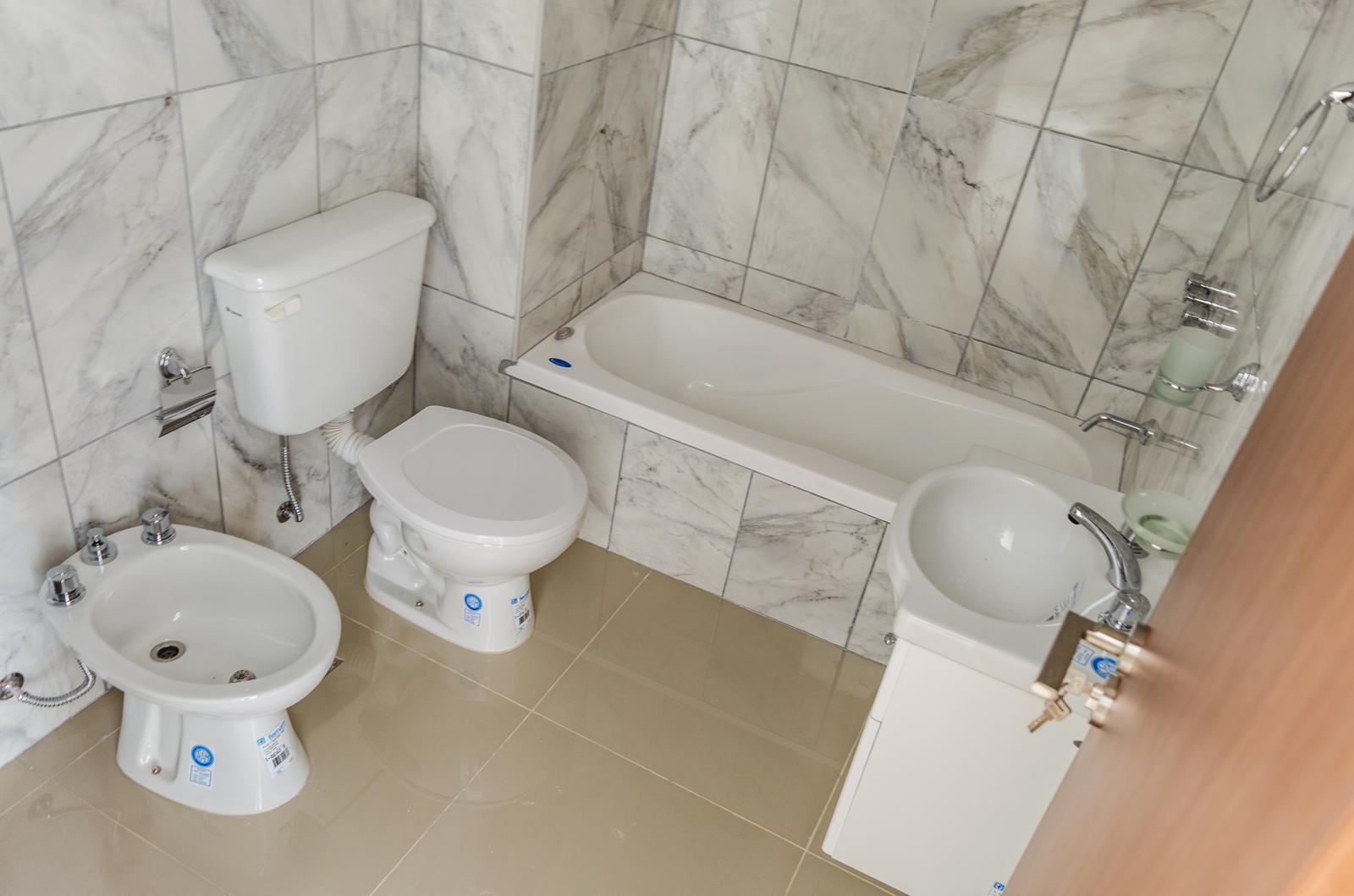 Baño con revestimiento de porcelanato símil mármol, sanitarios de loza y bañera.