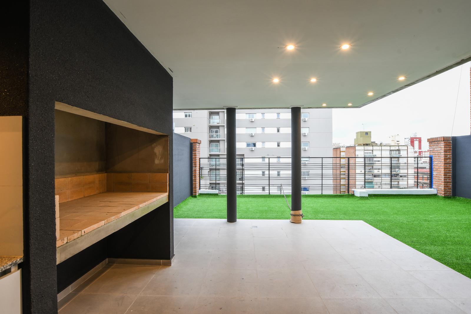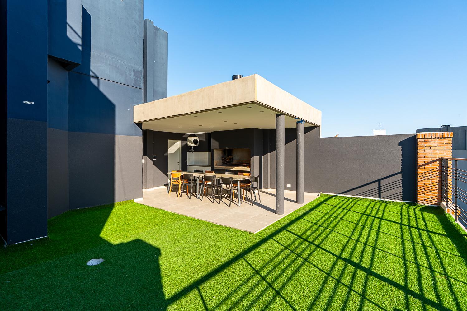 Azotea con quincho cubierto de uso común, con parrillero, baño y solárium, orientación Norte.