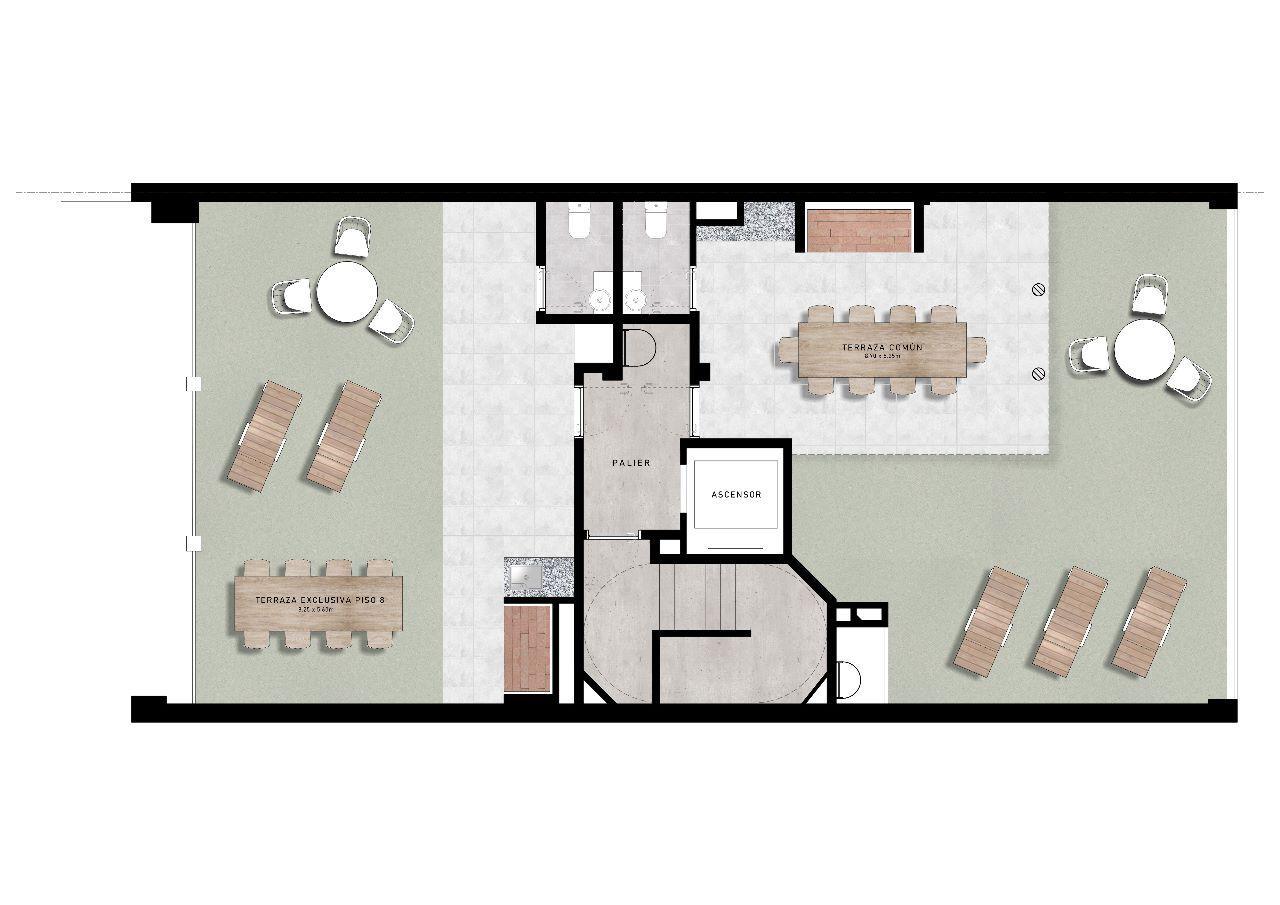 Edificio constituido por 8 pisos en total, con 22 Unidades comprendidas entre los pisos 1º y 8º. En la PB cuanta con 5 unidades de cocheras, azotea con parrillero cubierto y solárium. Cumple con la ordenanza que contempla los aspectos higrotérmicos (eficiencia energética).
