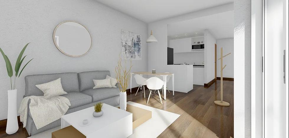 La unidad contara con pisos de porcelanato símil madera en cocina y baños; en el balcón tendrá cerámicos esmaltados para exteriores. La puerta balcón será corrediza de aluminio blanca con persianas de PVC estilo Módena.