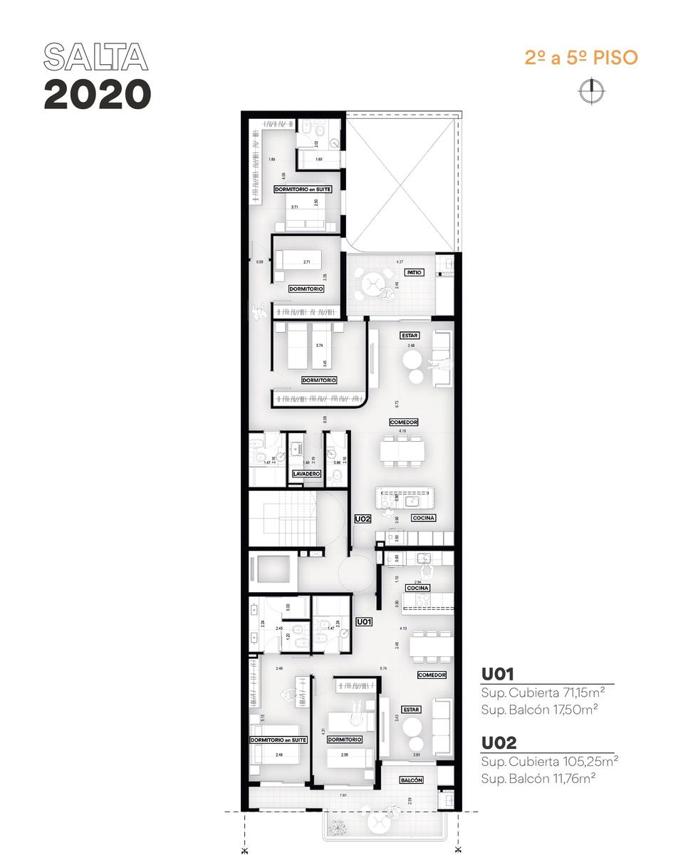 Tipologías destacadasU01: 71,15 m2 cubiertos + 17,50 m2 de balcón.U02: entre 71,35 m2 y 105,25 m2 cubiertos, con balcones, patios o terrazas privadas de hasta 40,80 m2.Octavo piso: exclusivo departamento de 130,55 m2 cubiertos, con balcón y dos terrazas privadas de 23,10 m2 y 43,10 m2.