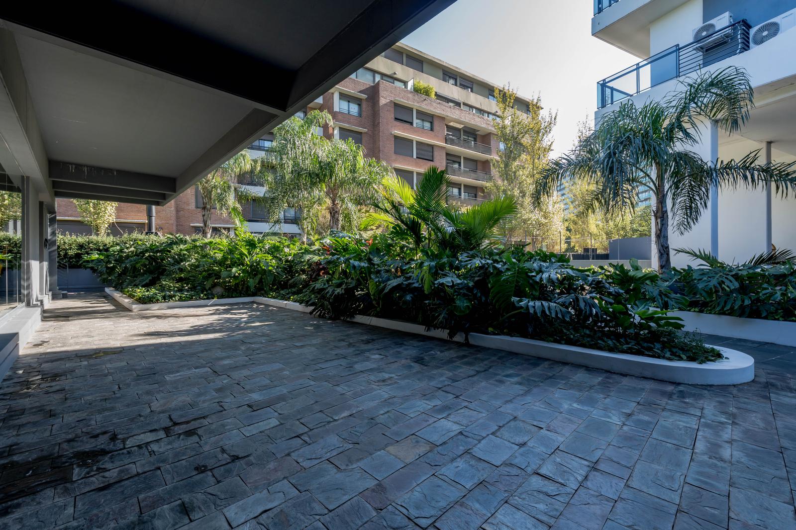 El acceso al departamento es a través de uno de los tres ascensores desde un imponente hall. El interior consta de un living comedor con cocina semi-integrada, equipada con muebles de calidad Reno, horno, anafe, espacio para lavarropas, y aberturas DVH. El baño es completo, y el dormitorio incluye placard y acceso al balcón. La climatización se realiza mediante aire acondicionado.