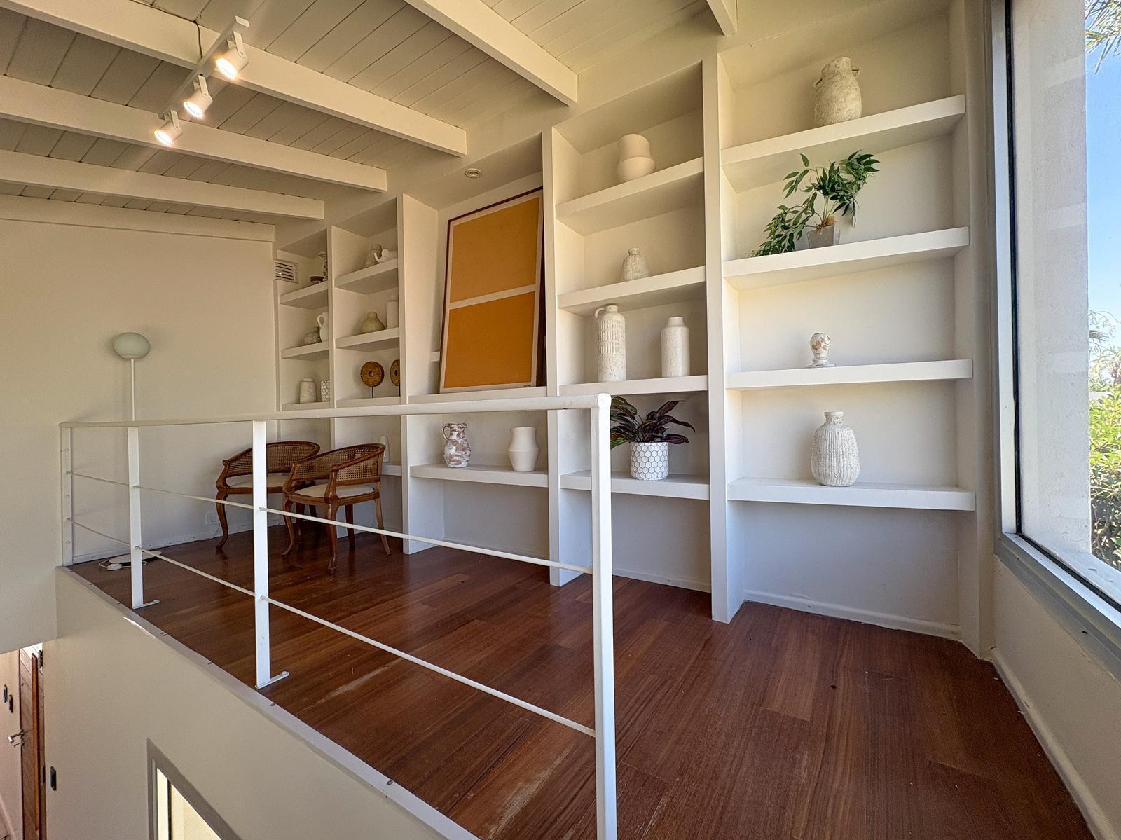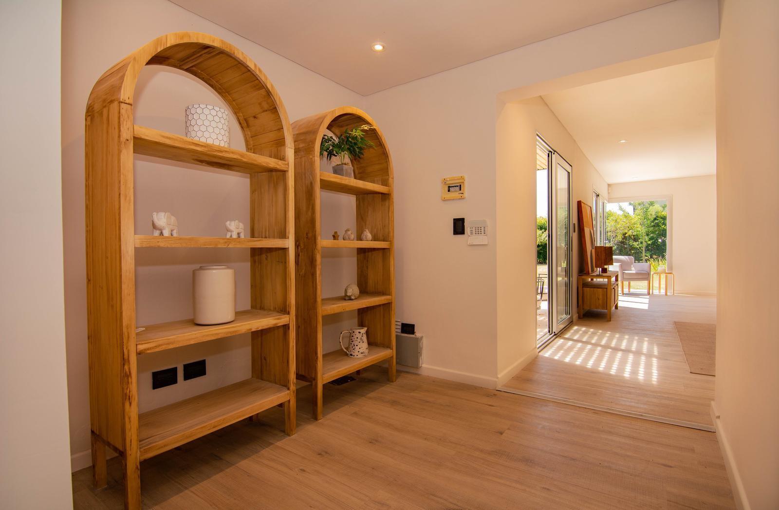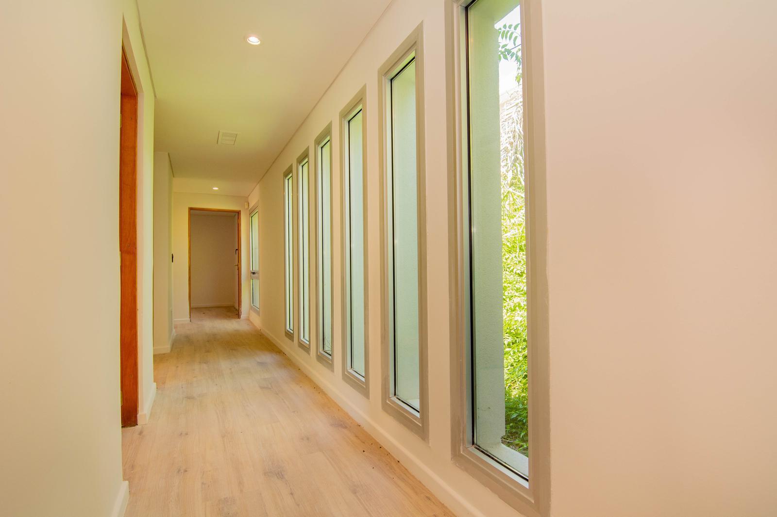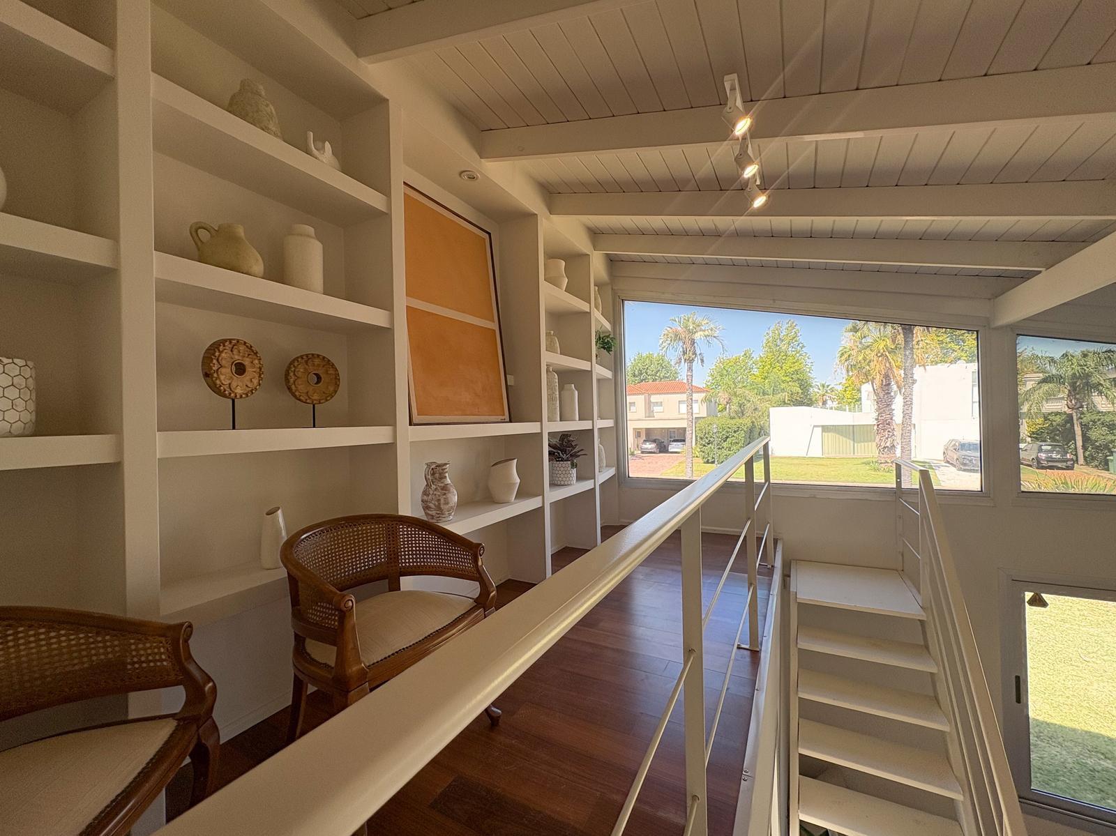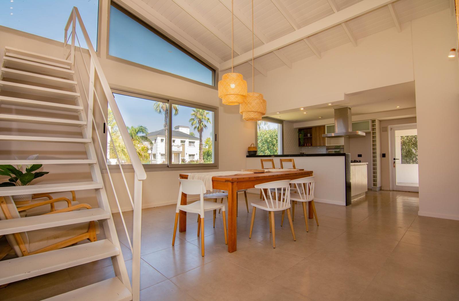 Al ingresar a la vivienda, un pasillo distribuidor da acceso a las distintas áreas de la casa. A la izquierda, se ubica una cocina-comedor de diseño moderno, equipada con barra desayunadora, anafe de cinco hornallas, horno empotrado y campana de acero inoxidable. Este espacio incluye un lavadero independiente y un toilette de recepción. Una escalera lleva a un espacio elevado ideal para lectura o para uso como escritorio, aprovechando la doble altura del ambiente.