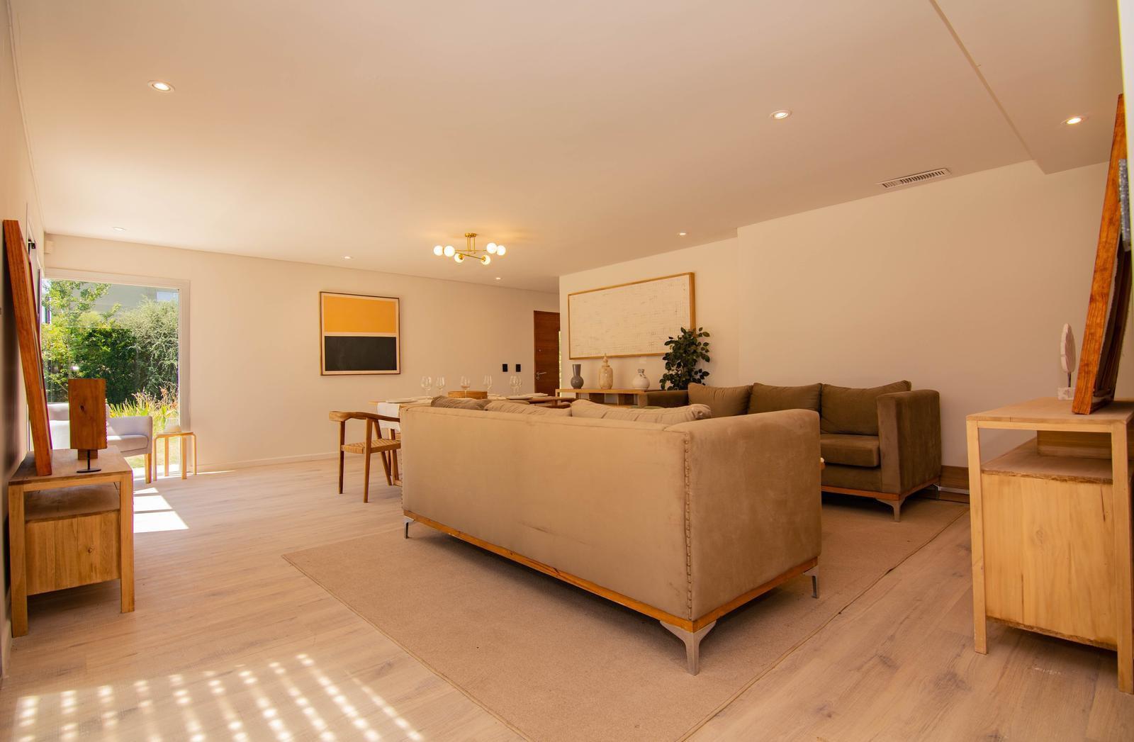 Detalles de calidad que destacan incluyen pisos de porcelanato y madera de ingeniería, aberturas de aluminio con DVH, y baños de primera línea. La propiedad ofrece servicios esenciales como agua corriente, gas natural, internet, y más, asegurando una calidad de vida excepcional en un entorno inigualable.
