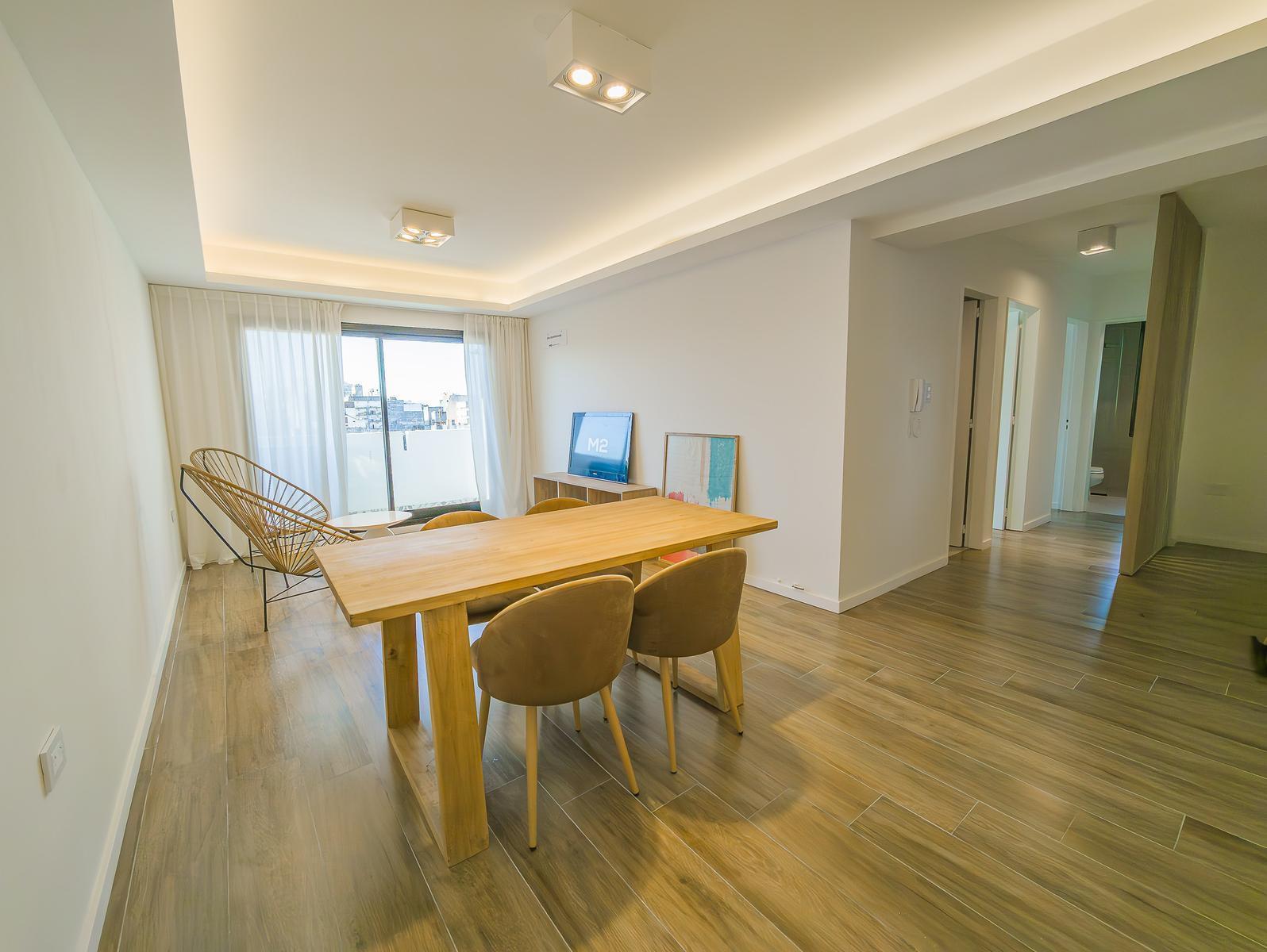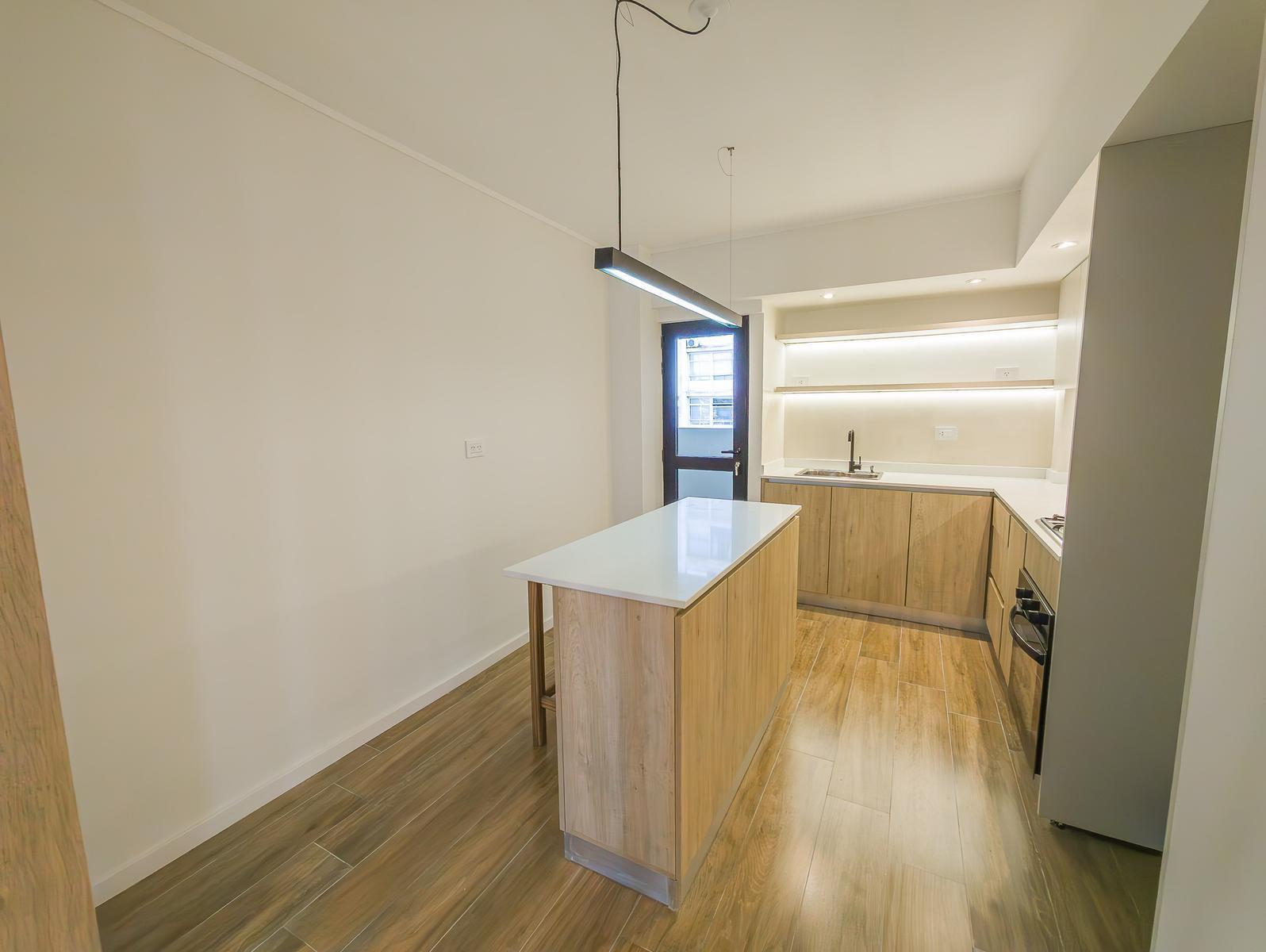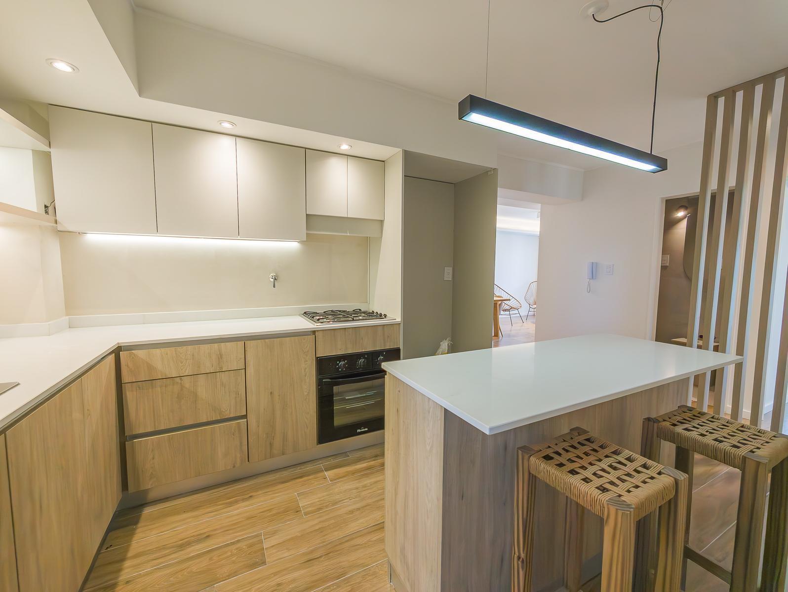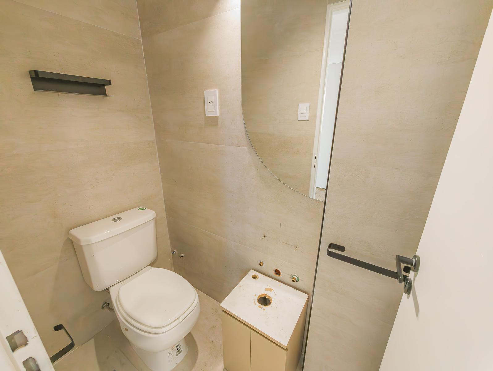 El departamento cuenta con 2 baños completos y un toilette de recepción, diseñados con loza sanitaria y griferías de primeras marcas. El amplio estar comedor, junto con una cocina semi-integrada que incluye isla, alacenas y bajo mesadas, crea un ambiente ideal para la vida familiar. La cocina está equipada con horno eléctrico, anafe a gas, y espacio técnico para heladera.