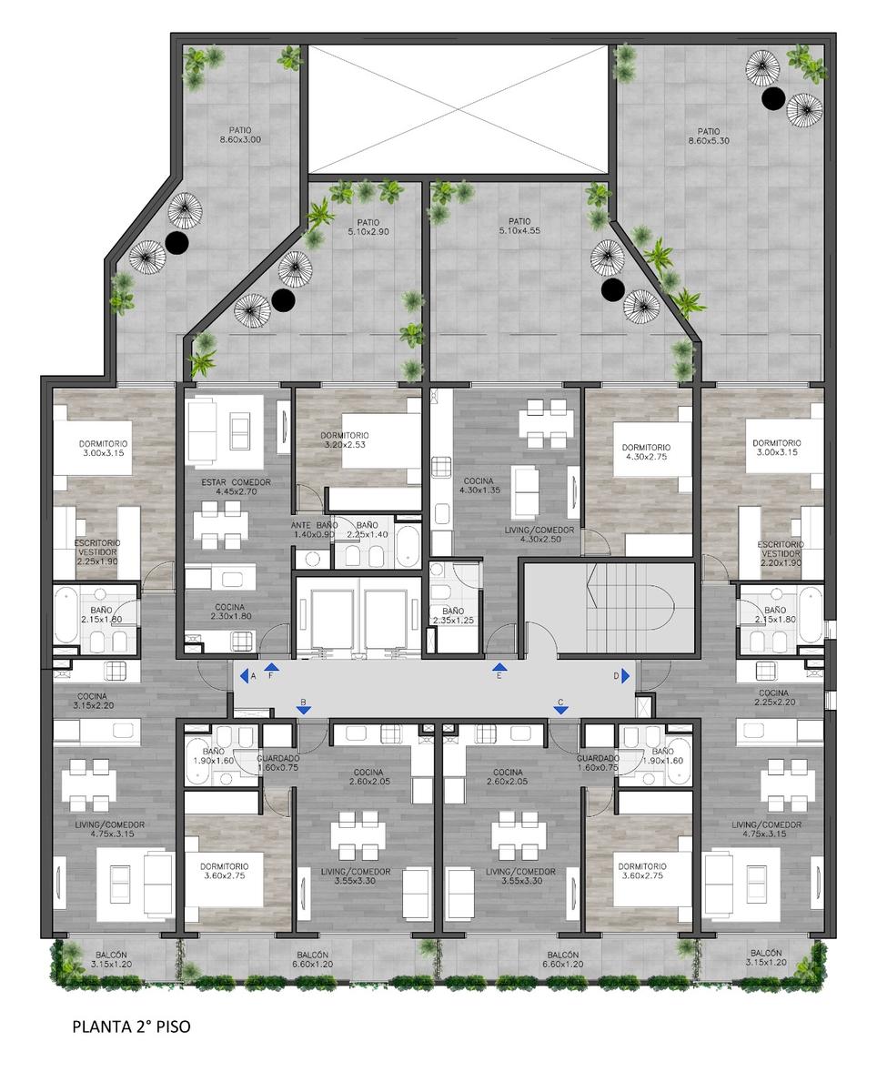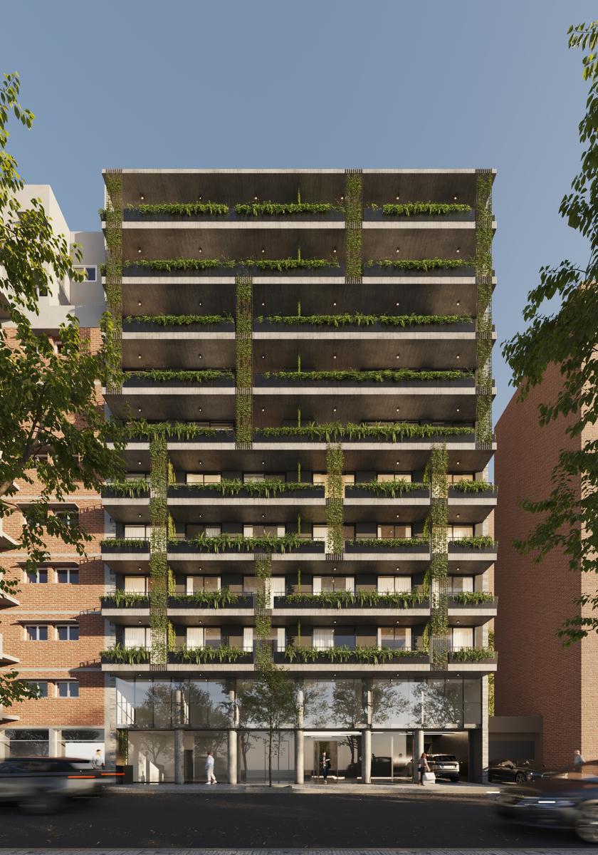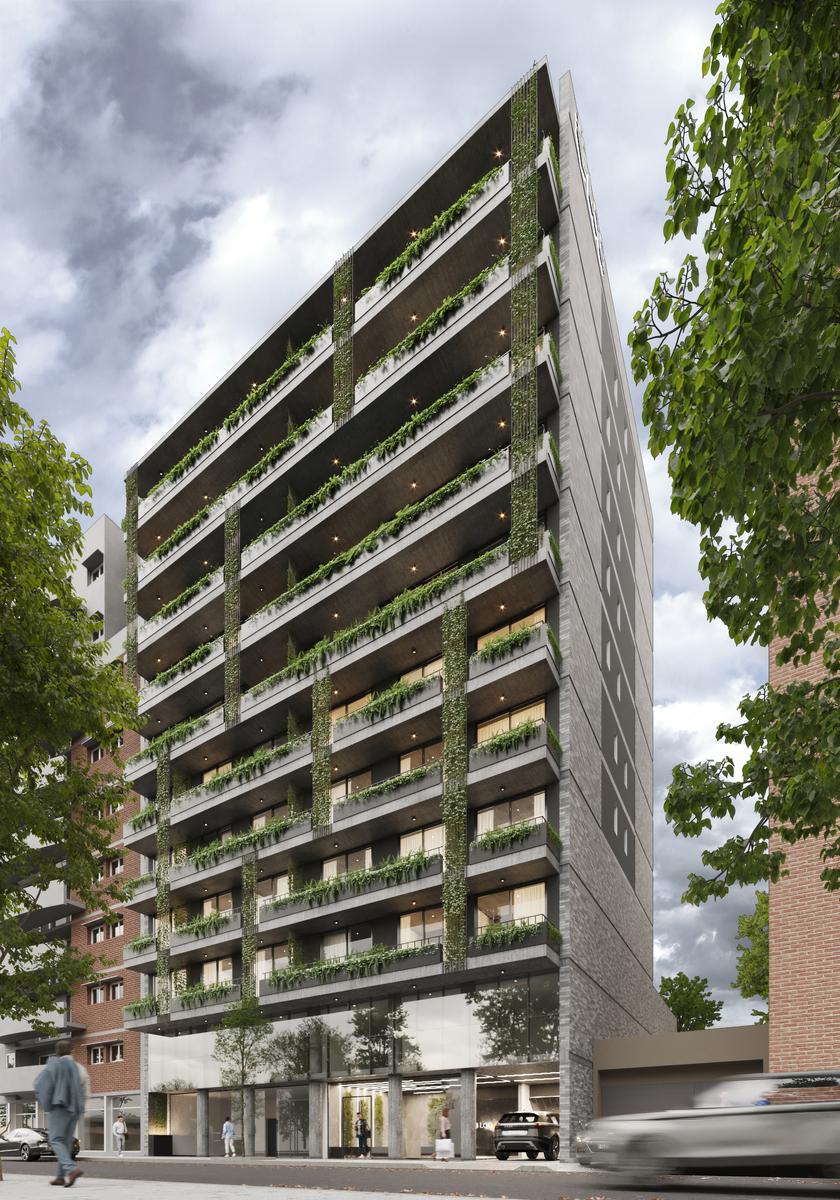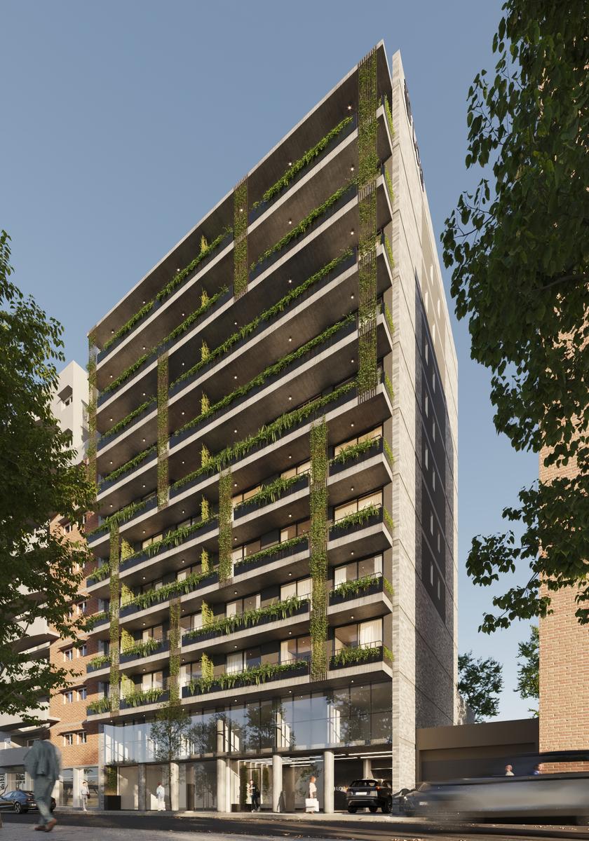 DEPARTAMENTOS Desde el segundo piso se desarrollan unidades de vivienda de uno, dos y tres dormitorios con terminaciones de alta calidad. Puertas de ingreso de seguridad. Cocinas equipadas con alacenas y muebles bajo mesada, anafe de 4 hornallas, horno empotrado y calefón marca Longvie o similar, mesadas de granito y bachas de acero inoxidable. Pisos porcelanatos en living, cocina, baños y balcones. Piso de instalación flotante símil madera en dormitorios para brindar calidez a estos ambientes. Placares con interior. Amplios balcones aterrazados y aberturas de aluminio con doble vidriado hermético. Pre instalación para AA.