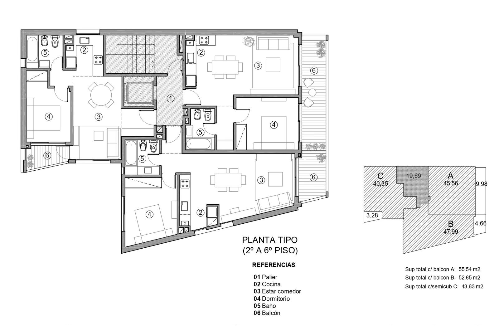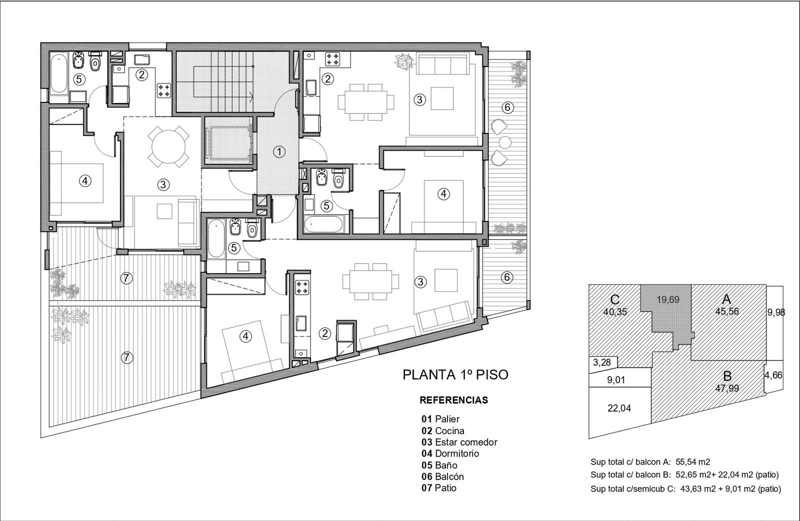 Características del Proyecto:* Edificio de Planta Baja + 6 pisos + Terraza con amenities* Local comercial en PB (único)* Unidades de 1 dormitorio desde 43 m² a 55 m² (con patios en primeros pisos o amplios balcones en pisos superiores)