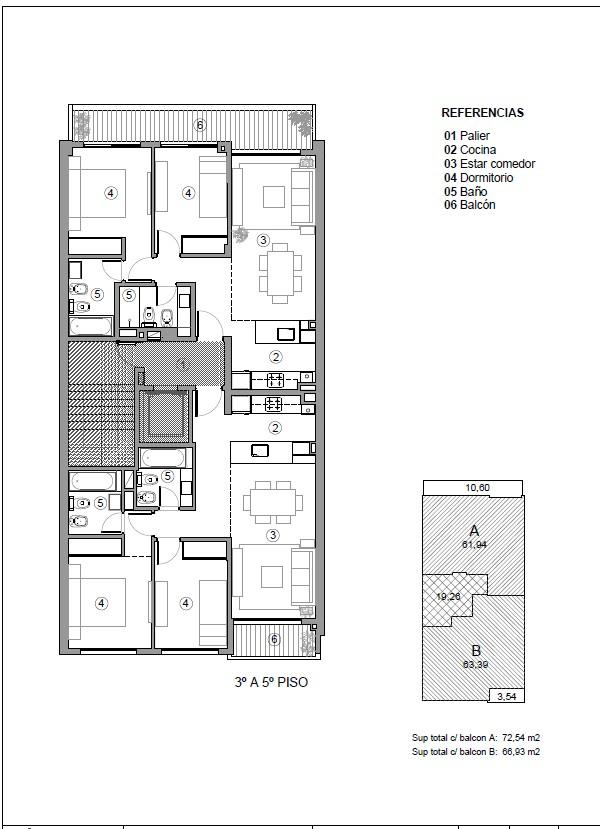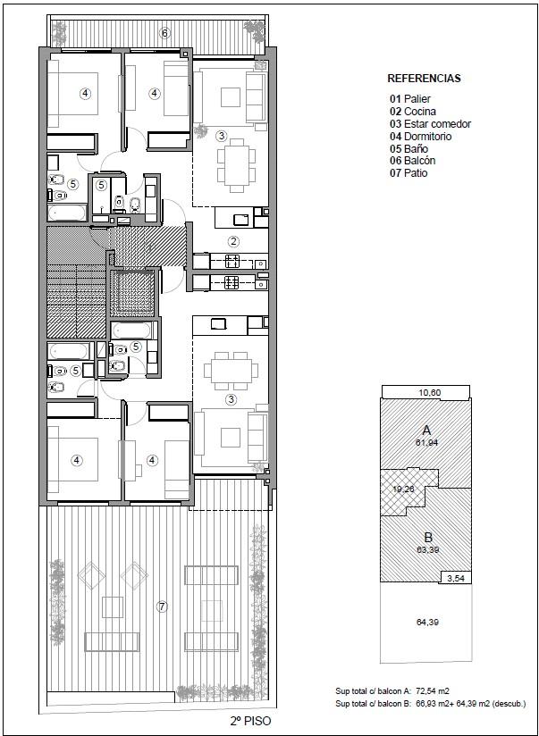 Unidades Disponibles Pisos 1º a 5º – Semipisos de 2 dormitorios * Unidades al frente (orientación Norte) y al contra frente (orientación Sur). * Amplio living-comedor con cocina semi integrada. * 2 dormitorios con placares completos, revestidos interiormente. * 2 baños completos con bañera. * Balcón al frente o contra frente, según unidad.